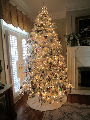 And now I have to admit---I MADE A MISTAKE! The tree is so WHITE that my ornaments don't even show up! I love my tree to be chock full of ornaments and it is---you just can't see them!!