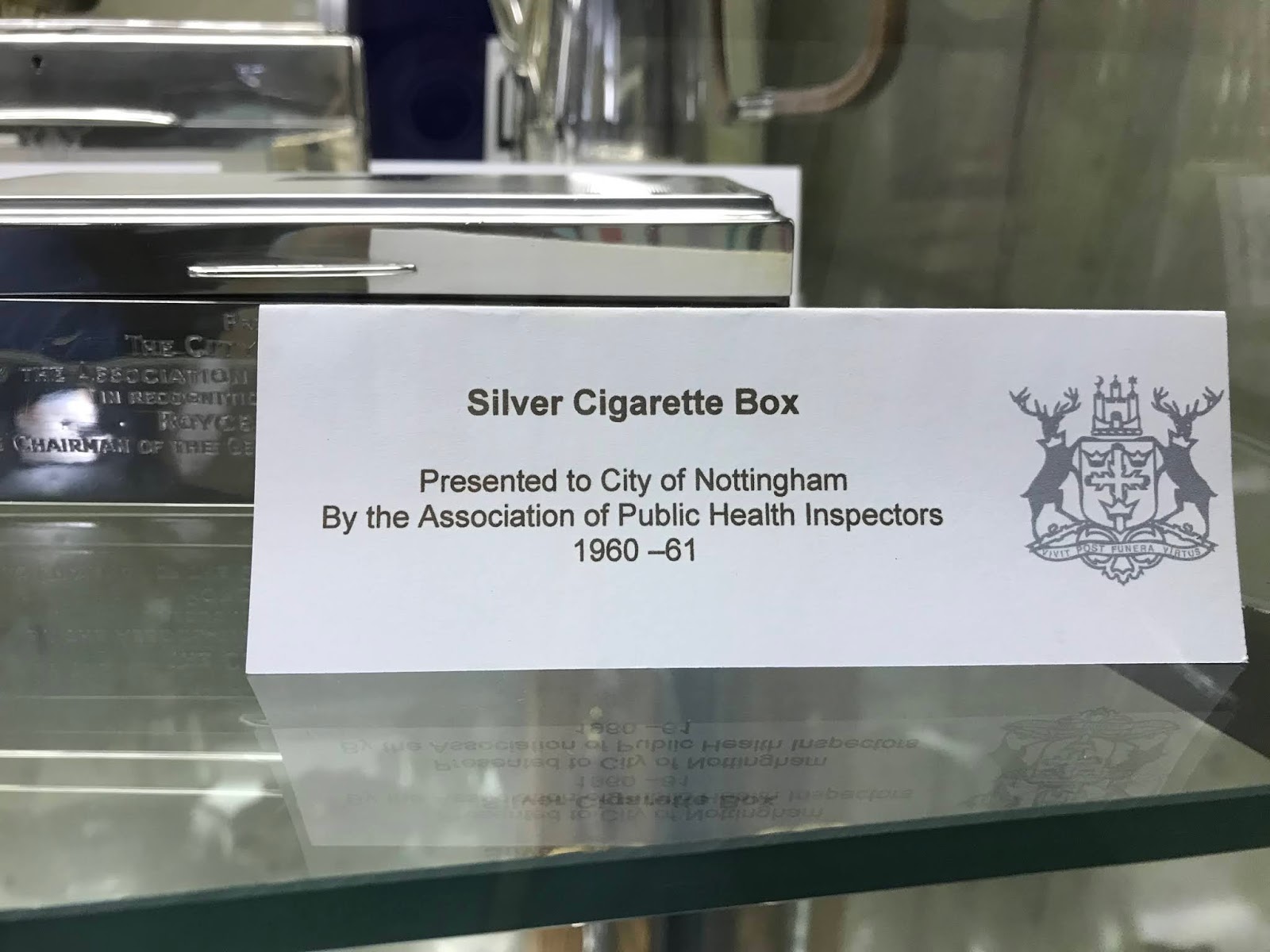 When Gren got us in the Council House and we got that private tour, I stopped to look in this case of silver. Karolyn pointed this out. I thought it was pretty ironic, so had to take a picture. Of course back in 1961, you could still smoke everywhere!