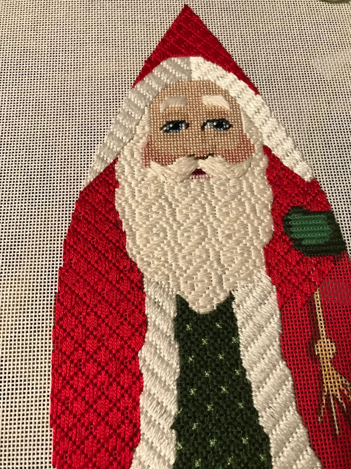 All I have left now is the red on the robe which is on all four panels. It's a time consuming stitch because you have to pull the threads apart, then use your fingers to smooth them and lay each stitch individually. What you see here took me about 4 evenings. I figure I'll finish it in another couple weeks. I've already missed the deadline for Christmas, so it will be ready for next year.