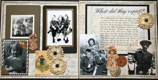 This is my layout for our every other month "round robin" where we each do a layout for someone else. I was thrilled to do a vintage layout where I could use some cabinet cards, mini doilies (I put a brad in the middle), vintage ledger paper, milk caps and some mini "dolly" books.