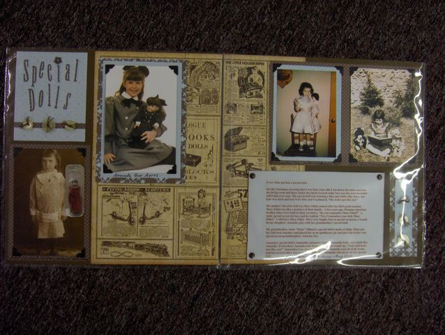 I presented my last class with a challenge---create a layout based on a connection you were able to make since re-organizing your pictures in this new system. Although 7 "signed up", only 4 actually came. That's okay---they gave me some really good feedback. The statement that struck me the most---one of the girls said that when I stated in class---"if you don't tell the stories, it's only pictures on a page"---that this is when it really "clicked" with her. Be sure to notice her "doll" layout. She had photos of her grandmother, her mom, herself and daughter with their favorite dolls. Her daughter's doll (which is Samantha from the American Girl collection) is very similar to that of her grandmother---same time period. By re-organizing her photos, she saw that connection right away.
