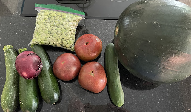 What we have here are 3 small zucchini, 1 red onion, 3 tomatoes, about 2 cups off fresh lima beans (so delicious), 1 cucumber, and a watermelon. You are looking at $32.68 worth of produce. It's worth it to me! Still, that seems like a lot.